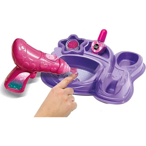 دستگاه شاین لاک کلمنتونی یک ایستگاه کاری کوچک و قابلحمل است که با طراحی ارگونومیک و رنگهای شاد صورتی، سفید، و بنفش، برای کودکان جذابیت بصری بالایی دارد. دستگاه شامل محفظهای برای بارگذاری پودرهای اکلیلی و مکانیزمی برای پاشیدن اکلیل روی ناخنهای لاکزده است. پودرهای اکلیلی در رنگهای متنوع (مانند طلایی، نقرهای، و چندرنگ) ارائه میشوند و با برسهای دقیق و ابزارهای تزئینی همراه هستند تا کودکان بتوانند طرحهای خلاقانه ایجاد کنند. طراحی دستگاه بهگونهای است که استفاده از آن برای کودکان ساده باشد، و اکلیل بهصورت یکنواخت روی لاک پاشیده میشود تا جلوهای براق و حرفهای ایجاد کند. دفترچه راهنما با تصاویر رنگی، فرآیند استفاده از دستگاه و تزئین ناخن را گامبهگام توضیح میدهد و نکات علمی درباره خواص مواد و چسبندگی اکلیل را ارائه میکند. این کیت نیازی به دستگاه UV-LED ندارد، زیرا اکلیل روی لاک مرطوب میچسبد و با خشک شدن لاک تثبیت میشود، که ایمنی و سهولت استفاده را افزایش میدهد.