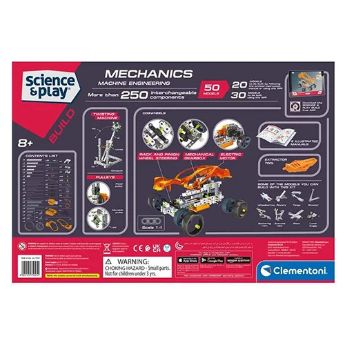 مهندسی مکانیک ماشین کلمنتونی (Clementoni Mechanics Laboratory Engineering of Machines) با کد 75025، یک مجموعه علمی و آموزشی پیشرفته از سری Science & Play کلمنتونی است که برای کودکان و نوجوانان (8 سال به بالا) طراحی شده و تجربهای عملی از اصول مکانیک و مهندسی ارائه میدهد. این کیت، با الهام از فناوریهای مهندسی، کودکان را به ساخت بیش از 50 مدل متنوع، از جمله هلیکوپتر، جرثقیل موتوردار، و ماشین با موتور الکتریکی و فرمان قابل کنترل، تشویق میکند و مفاهیم STEM (علوم، فناوری، مهندسی، و ریاضیات) را به شکلی جذاب آموزش میدهد. شامل بیش از 250 قطعه پلاستیکی، موتور الکتریکی، و دفترچه راهنمای مصور است که فرآیند مونتاژ را ساده میکند. این محصول با استانداردهای ایمنی اروپا (EN71) و آمریکا (ASTM F963-11) ساخته شده و از پلاستیک ABS غیرسمی و مقاوم تشکیل شده است، که ایمنی و دوام آن را تضمین میکند.