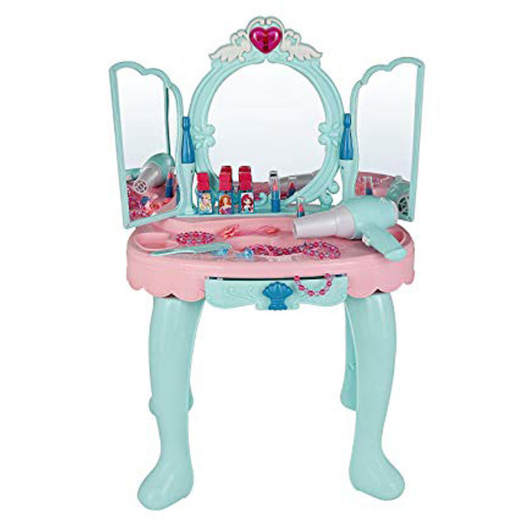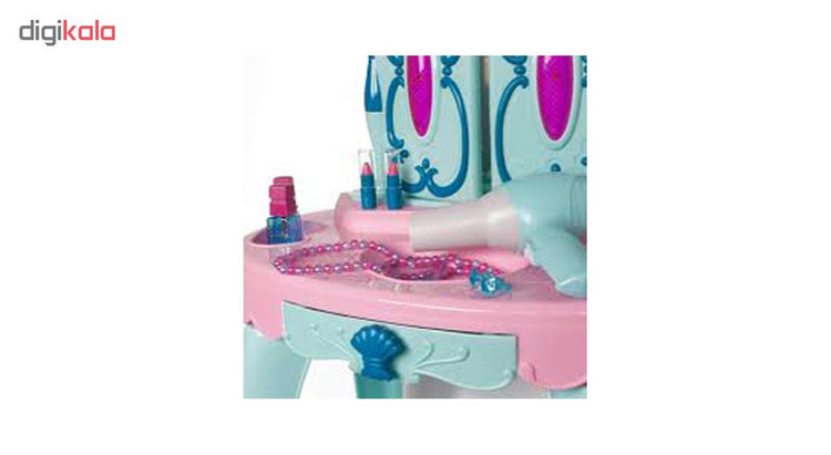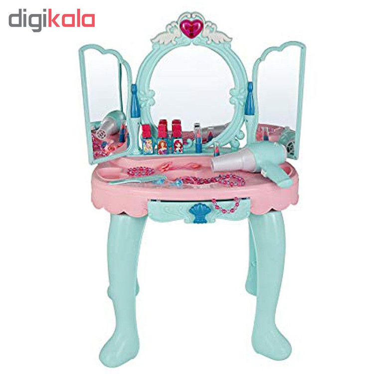 اسباب بازی میز آرایش شامل یک عدد سشوار باتری خور، 3 لاک، 2 رژ لب، 2 کش مو، 2 دستبند، 3 انگشتر، 1 شانه، 1 گردنبند میشه. دکمه ی قلبی شکل در بالای میز آرایش کودک رو فشار بدین تا با نور و صدای زیباش شما رو سورپرایز کنه.