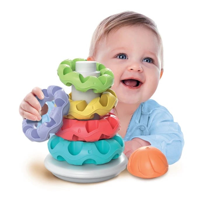 ⸻ ۵ حلقه رنگارنگ با اندازههای مختلف وجود دارد که کودک میتواند آنها را روی پایهای گهوارهای شکل بچیند و تعادل را تجربه کند. سطح حلقهها بهگونهای طراحی شده است که با بافتهای مختلف، حس لامسه کودک را تحریک میکند. پایهی ناپایدار این اسباببازی، تعادل کودک را به چالش میکشد و او را به تمرین مهارتهای حرکتی دعوت میکند. کودک در حین بازی با این حلقهها، رنگها، اشکال و اندازههای گوناگون را تشخیص میدهد و یاد میگیرد. این بازی به کودک کمک میکند تا مهارتهای حرکتی ظریف خود را تقویت کند. از طریق این فعالیت، کودک قدرت بینایی خود را به کار میگیرد و هماهنگی بین چشم و دست را افزایش میدهد. با چیدن حلقهها، کودک مفهوم اندازه، ترتیب و تعادل را تجربه میکند