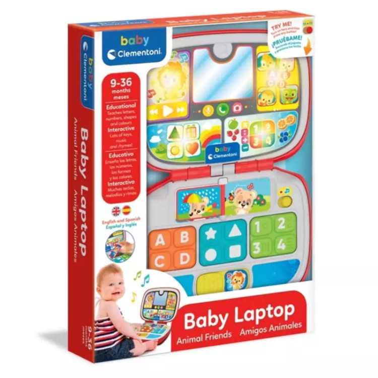 لب تاپ موزیکال و اموزشی از برند ایتالیایی کلمنتونی مه برای کودکان زیر 3 سال طراحی شده و هیچ گونه مواد سمی در متریال ان استفاده نشده و دو زبان انگیلیسی و اسپانیایی رو پشتیبانی میکنه