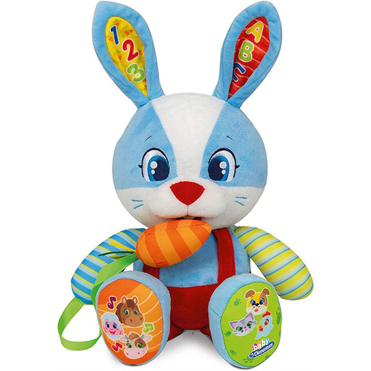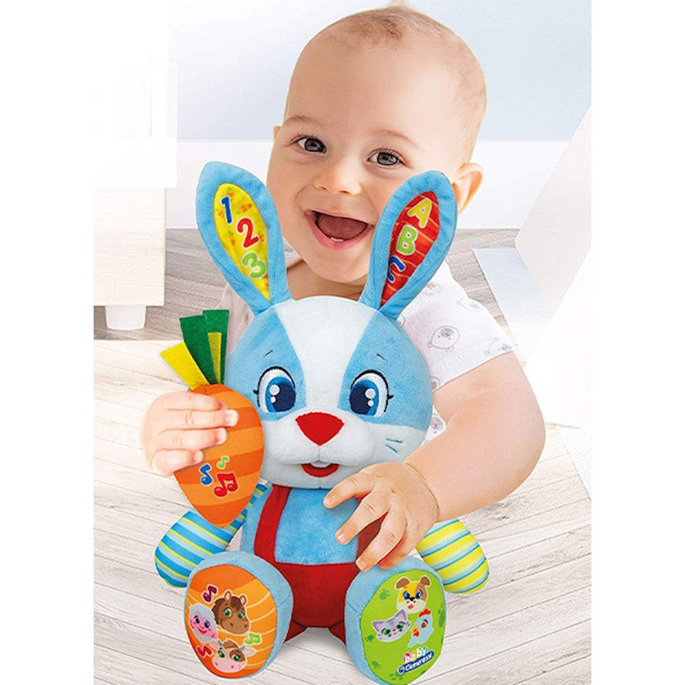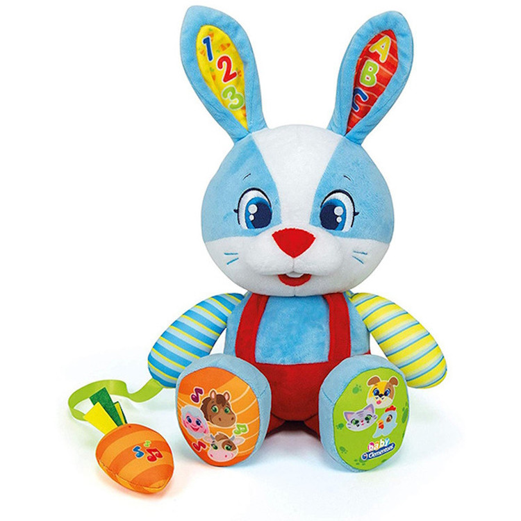 محصولات نوزادان و خردسالان Clementoni با هدف تقویت ذهن، حواس پنج گانه و عضلات کودک و برای آموزش همراه با بازی برای کودکان تولید میشوند. باتوجه به تماس دست و دهان کودکان با اسباببازی، محصولات کلمنتونی از بهترین مواد اولیه و پلاستیک درجه یک و همچنین رنگهای طبیعی تولید میشوند. این شرکت بزرگ طیف گستردهای از اسباب بازیهای آموزشی را در رده سنی 0 تا 12 سال طراحی و تولید نمود که شامل، اسباب بازیهای سیسمونی، بازیهای فکری، بازیهای دیجیتال، پازل و… است. این شرکت همواره تلاش دارد تا محصولاتی به روز و مدرن را تولید کند و به همین علت و با یک استراتژی دقیق و هدفمند در طی سالهای فعالیت خود با همکاری بیش از 50 محقق، همواره نوآوری در محصولات را در سرلوحه کار خود قرار داده است. خرگوش کوچولوی مهربون یه دوست خوب برای کودکتون میشه! مناسب 10 ماه به بالا, دارای افکت صوتی ,آموزش اعداد و حروف انگلیسی، صدای حیوانات, جنس عروسک از پارچه و مواد اولیه با کیفیت، مطابق با استانداردهای بین المللی است